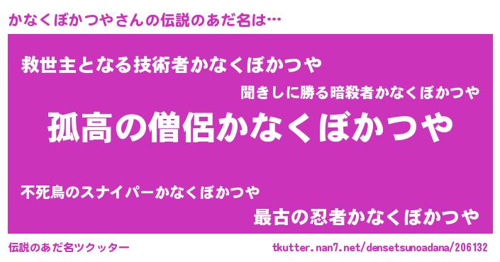 | 男性向けラノベタイトル風あだ名 | 『ダンジョンにかなくぼかつやを求めるのは間違っているだろうか』 |