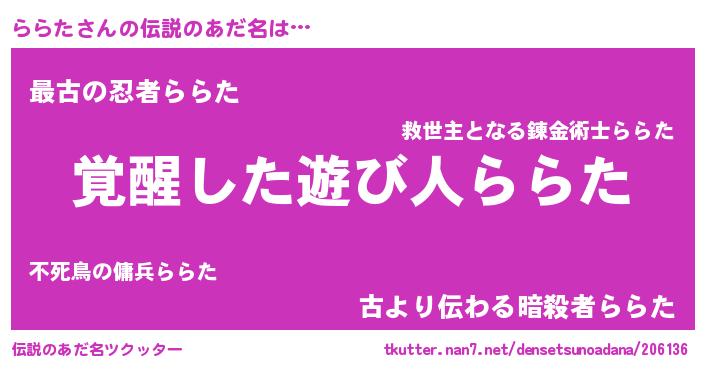 | 女子向けラノベタイトル風あだ名 | 『ららた様がみてる』『ららた伯爵の花嫁』 |