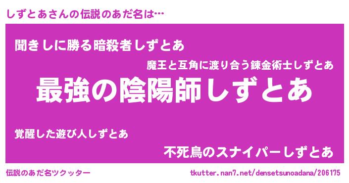 | 意味不明あだ名 | 『ヨモギ科しずとあ属』『自称しずとあ』 |