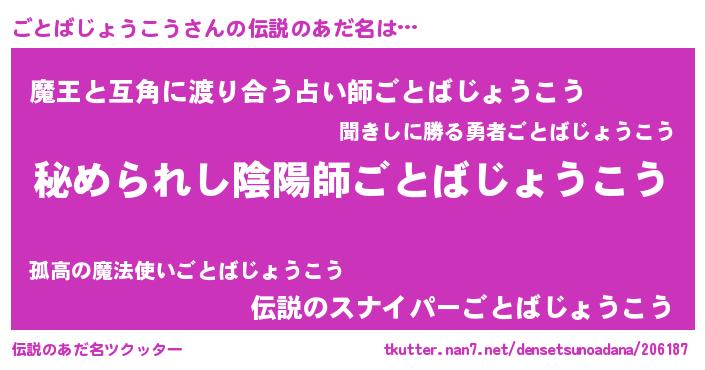 | 男性向けラノベタイトル風あだ名 | 『ゴトバジョウコウスレイヤー』 |