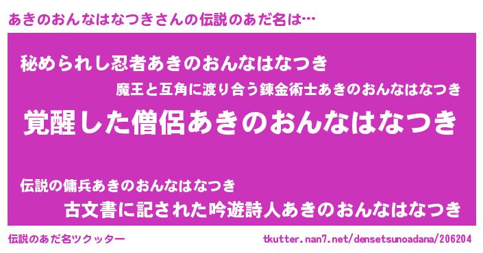 | 意味不明あだ名 | 『住所不定無職あきのおんなはなつき(14歳)』 |