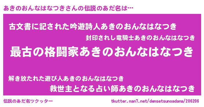 | 意味不明あだ名 | 『自称あきのおんなはなつき』 |