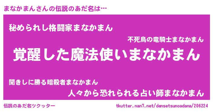 | 男性向けラノベタイトル風あだ名 | 『この素晴らしい世界にまなかまんを!』 |