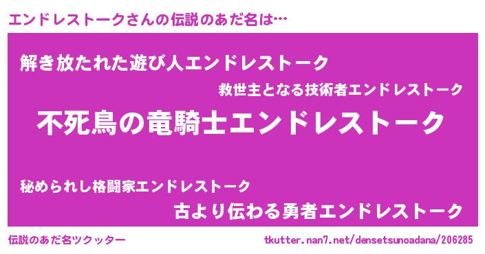 | 女子向けラノベタイトル風あだ名 | 『エンドレストーク姫と円卓の騎士』 |