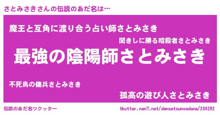 | 男性向けラノベタイトル風あだ名 | 『さとみさき~年齢イコール彼女いない歴の魔法使い~』 |