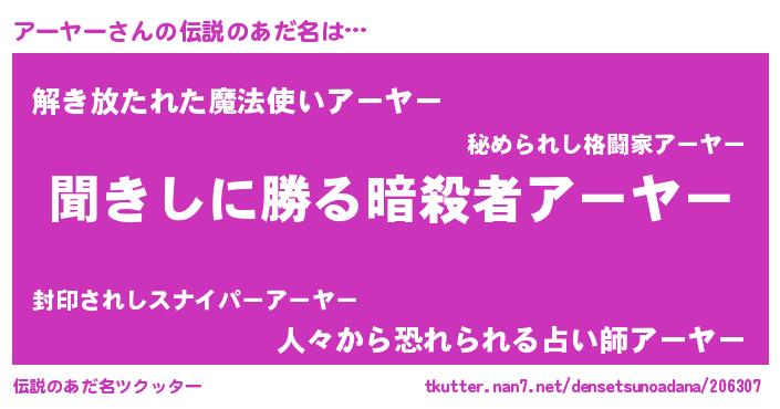| 意味不明あだ名 | 『自称アーヤー』『永久保存アーヤー』 |