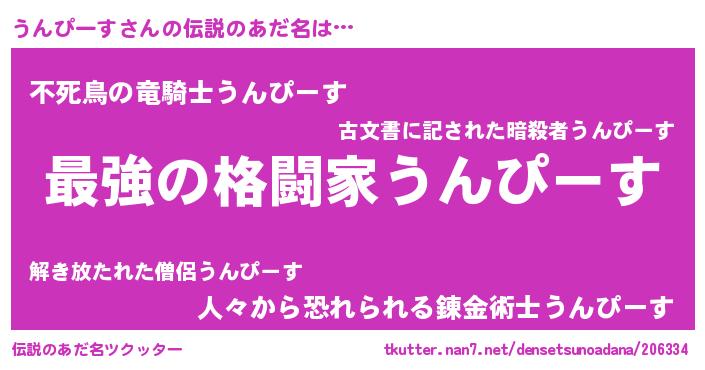 男性向けラノベタイトル風あだ名 | 『うんぴーす~年齢イコール彼女いない歴の魔法使い~』 |