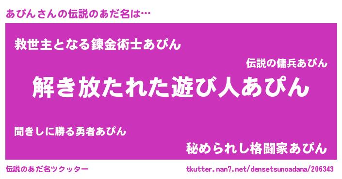 | 男性向けラノベタイトル風あだ名 | 『Re:あぴんから始める異世界生活』 |