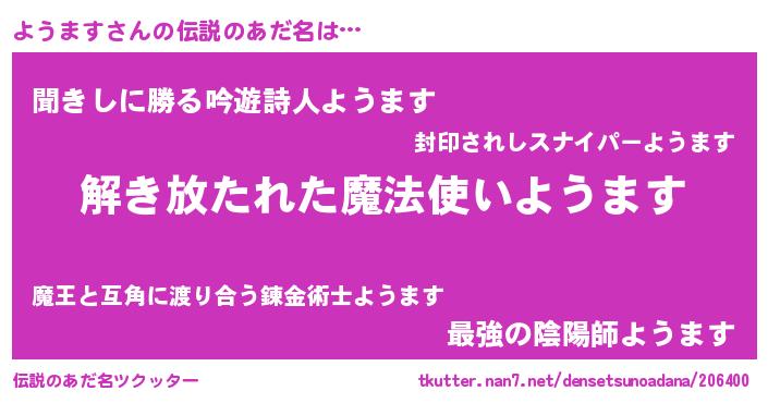 男性向けラノベタイトル風あだ名 | 『ようますに滅ぼされるだけの簡単なお仕事です』 |