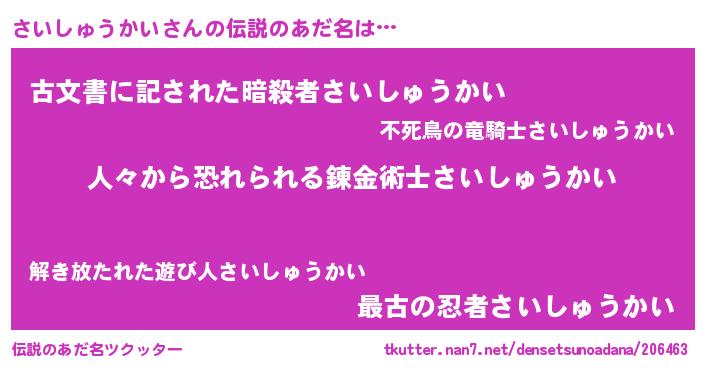 | 男性向けラノベタイトル風あだ名 | 『サイシュウカイスレイヤー』 |