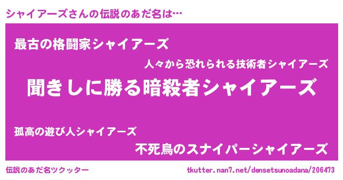 | 男性向けラノベタイトル風あだ名 | 『シャイアーズという概念が存在しない退屈な世界 』 |