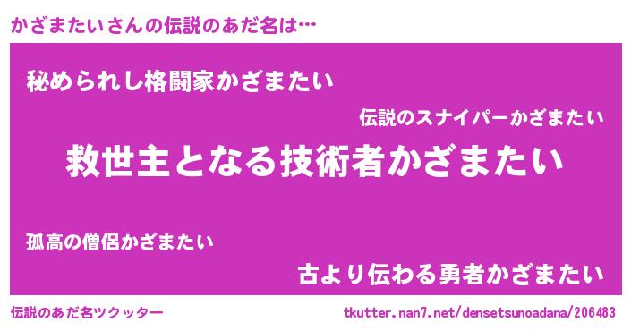| 男性向けラノベタイトル風あだ名 | 『かざまたいに滅ぼされるだけの簡単なお仕事です』 |
