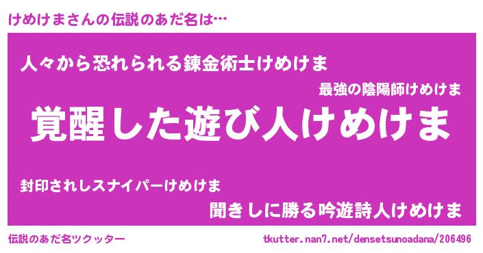 | ヒーロー風カッコイイあだ名 | 『天弓騎士ケメ』『正義の使者けめけま』 |