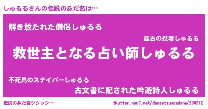 | ヒーロー風カッコイイあだ名 | 『慈愛の使者しゅるる』『魔戒騎士シュ』 |