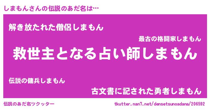 | ヒーロー風カッコイイあだ名 | 『天空の使者しまもん』『炎刃騎士シマ』 |