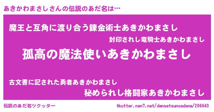 | 意味不明あだ名 | 『住所不定無職あきかわまさし(8歳)』 |