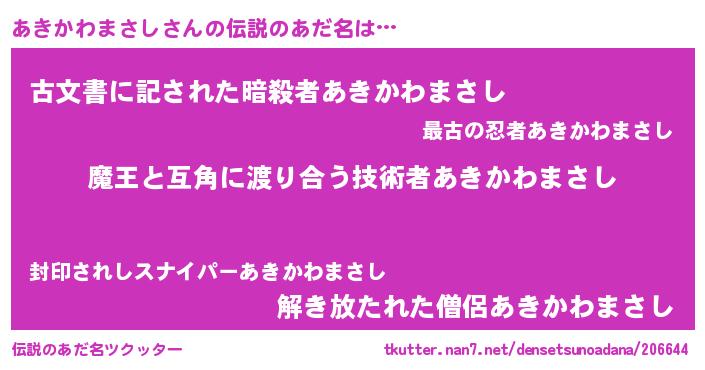 | ヘコむあだ名 | 『あきかわまさし(小並感)』『あきぷりん』 |