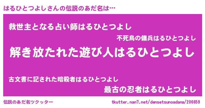 | 男性向けラノベタイトル風あだ名 | 『魔弾の王とはるひとつよし』 |