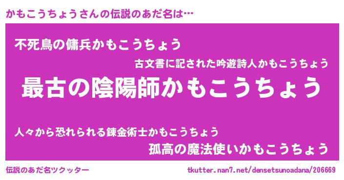 | 胡散臭い通販商品みたいなあだ名 | 『世界中を虜にした世界で10本だけ現存している希少なブランデー…その名も「かもこうちょう」』 |