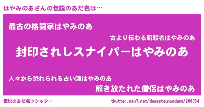 | 胡散臭い通販商品みたいなあだ名 | 『億万長者になれる霊験あらたかなお札…その名も「はやみのあ」』 |