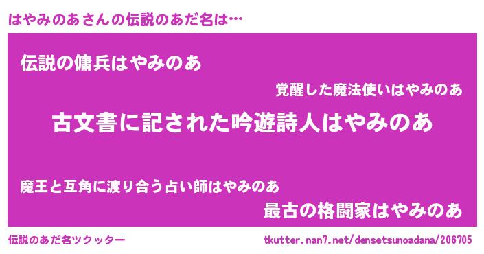 | 男性向けラノベタイトル風あだ名 | 『うちのはやみのあが世界を掌握している!』 |
