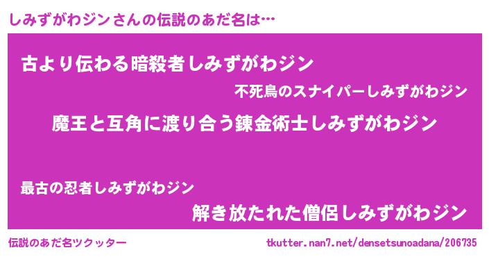 | ヒーロー風カッコイイあだ名 | 『慈愛の使者しみずがわジン』 |