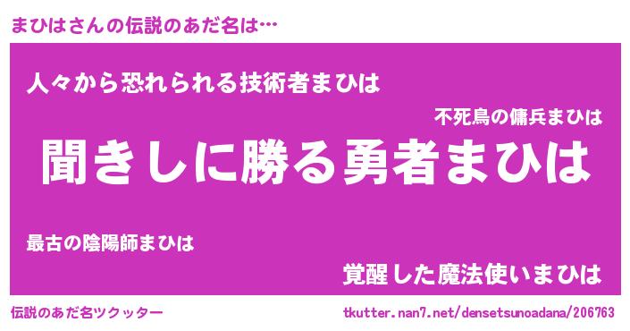 | 胡散臭い通販商品みたいなあだ名 | 『絶対に幸福をもたらす水素水…その名も「まひは」』 |
