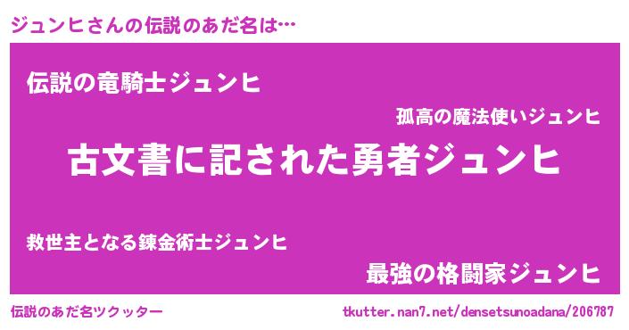 | 男性向けラノベタイトル風あだ名 | 『この素晴らしい世界にジュンヒを!』 |