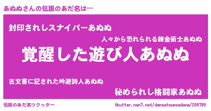 | 男性向けラノベタイトル風あだ名 | 『この素晴らしい世界にあぬぬを!』 |
