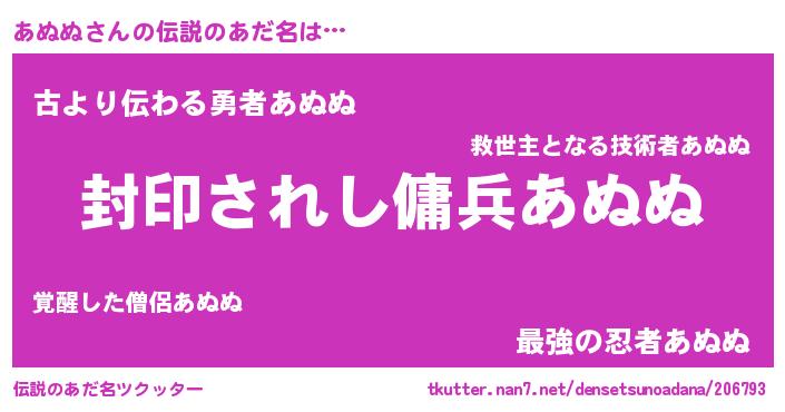 | 意味不明あだ名 | 『住所不定無職あぬぬ(68歳)』『自称あぬぬ』 |