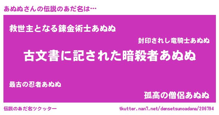 | ヒーロー風カッコイイあだ名 | 『ネオアヌヌ』『慈愛の使者あぬぬ』 |