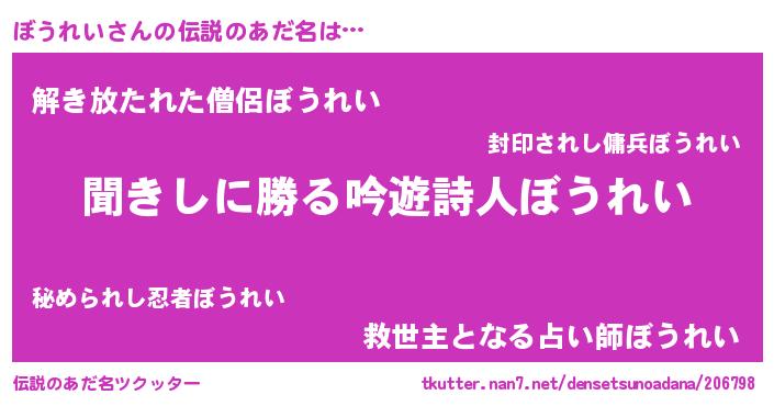| 男性向けラノベタイトル風あだ名 | 『ぼうれいという概念が存在しない退屈な世界 』 |