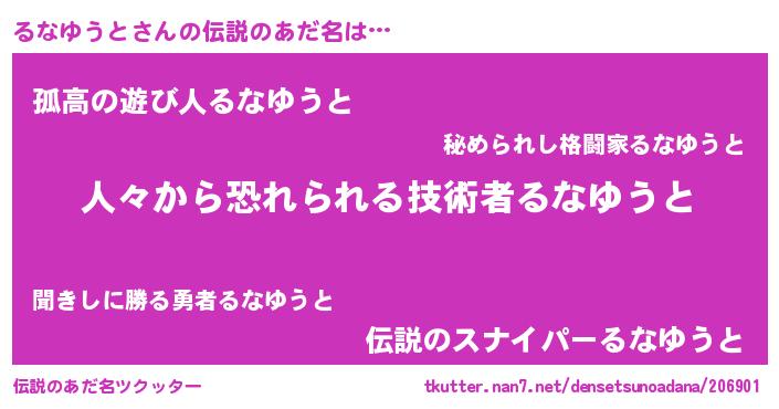 | 男性向けラノベタイトル風あだ名 | 『おまえをオタクにしてやるから、俺をるなゆうとにしてくれ! 』 |
