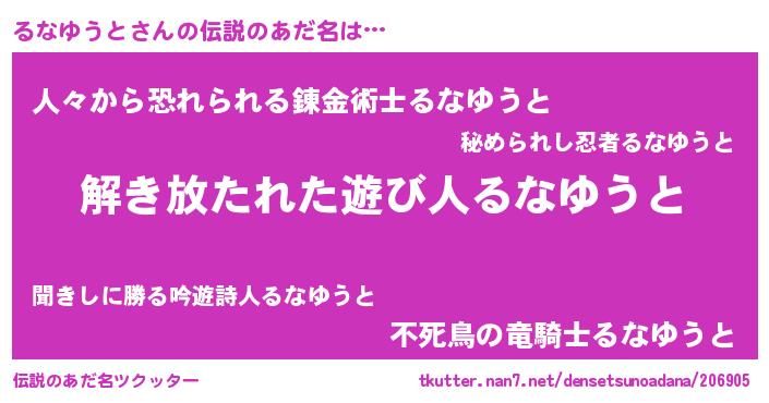 | 男性向けラノベタイトル風あだ名 | 『Re:るなゆうとから始める異世界生活』 |