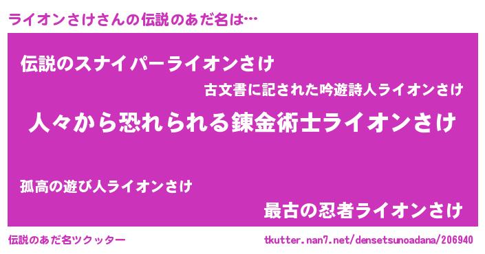 男性向けラノベタイトル風あだ名 | 『おまえをオタクにしてやるから、俺をライオンさけにしてくれ! 』 |