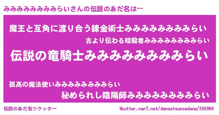 女子向けラノベタイトル風あだ名 | 『(仮)みみみみみみみみらいのやんごとなき事情』 |