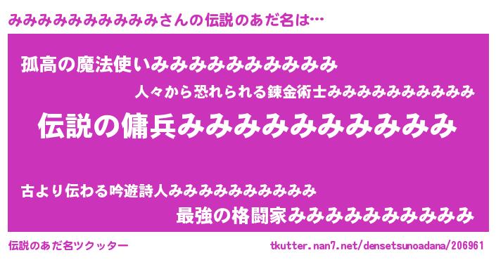 女子向けラノベタイトル風あだ名 | 『みみみみみみみみみみが死なない童話 林檎のみみみみみみみみみみの診療簿』 |