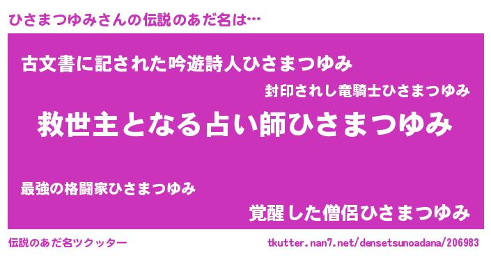 | ヘコむあだ名 | 『ひさまつゆみ(苦笑)』『ひさを』 |
