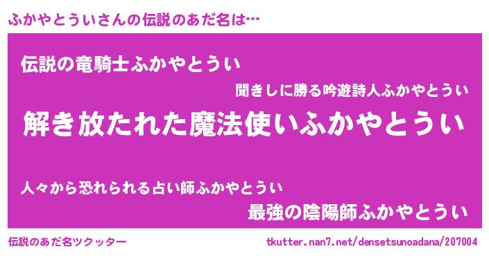 | 意味不明あだ名 | 『とにかく怪しいふかやとうい』 |