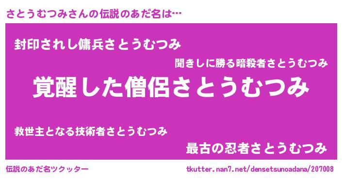 ヒーロー風カッコイイあだ名 | 『天弓騎士サト』『スーパーサトウムツミ』 |