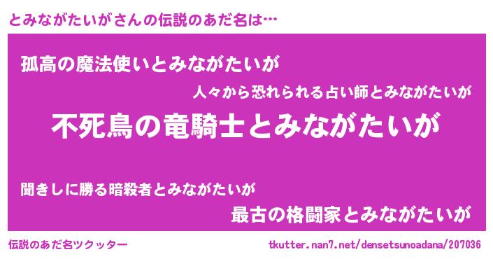 女子向けラノベタイトル風あだ名 | 『とみながたいが姫と円卓の騎士』 |
