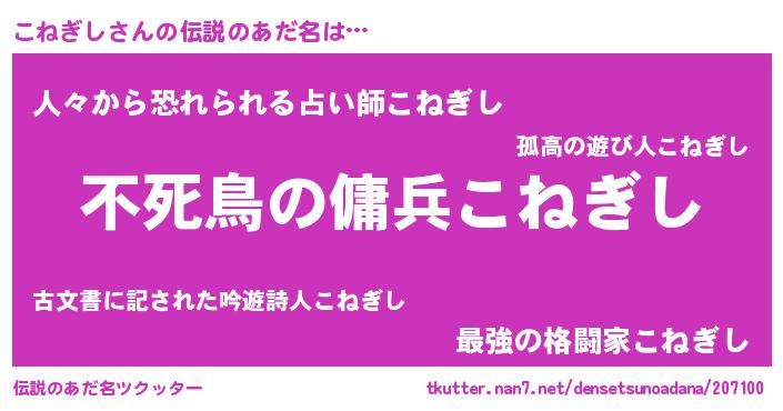 女子向けラノベタイトル風あだ名 | 『こねぎし姫と円卓の騎士』 |