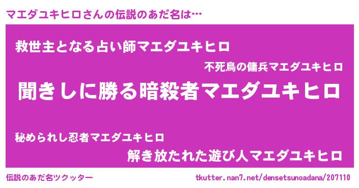 男性向けラノベタイトル風あだ名 | 『マエダユキヒロスレイヤー』 |