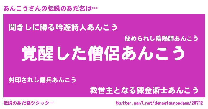 | ヒーロー風カッコイイあだ名 | 『炎刃騎士アン』『ネオアンコウ』 |