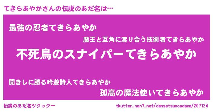 女子向けラノベタイトル風あだ名 | 『てきらあやか姫と円卓の騎士』 |