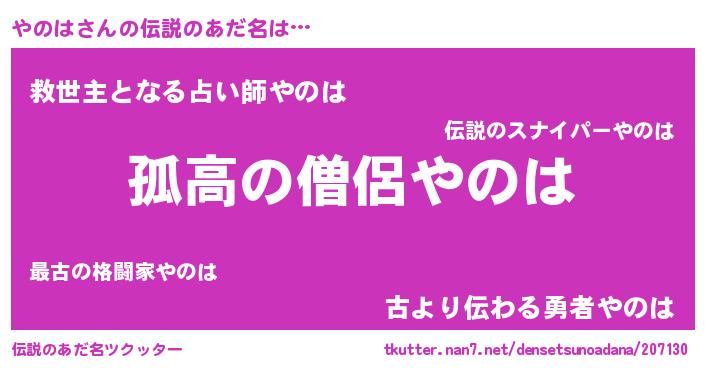 男性向けラノベタイトル風あだ名 | 『魔弾の王とやのは』『やのはの憂鬱』 |