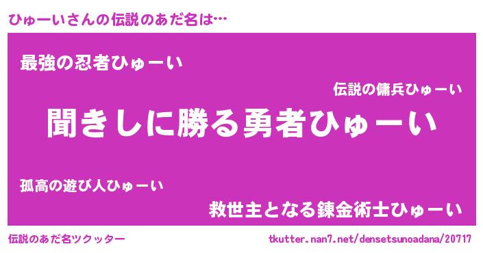 | 男性向けラノベタイトル風あだ名 | 『ひゅーいという概念が存在しない退屈な世界 』 |
