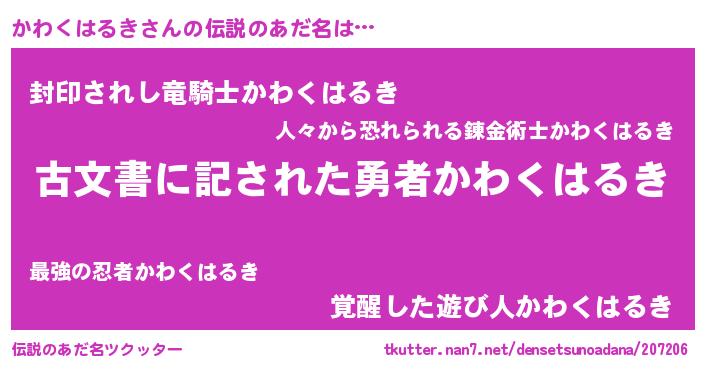 男性向けラノベタイトル風あだ名 | 『この素晴らしい世界にかわくはるきを!』 |