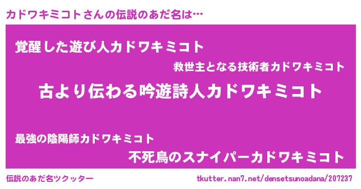 | 肩書あだ名 | 『カドワキミコト閣下』 |