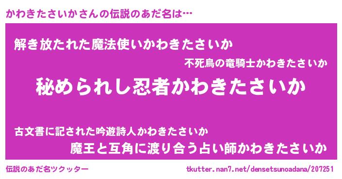 男性向けラノベタイトル風あだ名 | 『カワキタサイカスレイヤー』 |